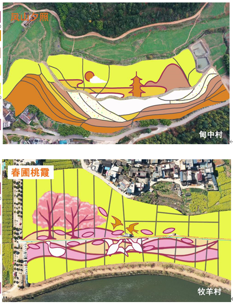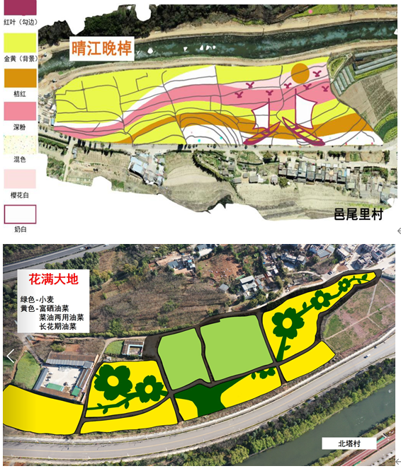 其中,甸中村油菜花種植約100畝,設(shè)計(jì)圖案為“鳳山夕照”;邑尾里村種植約60畝,設(shè)計(jì)圖案為“晴江晚棹”;牧羊村約60畝,設(shè)計(jì)圖案為“春圃桃霞”;白塔村約為60畝,其中20畝用于耕耘里蔬菜種植,其余采用小麥和油菜搭配圖案,圖案主題為“花滿(mǎn)大地”