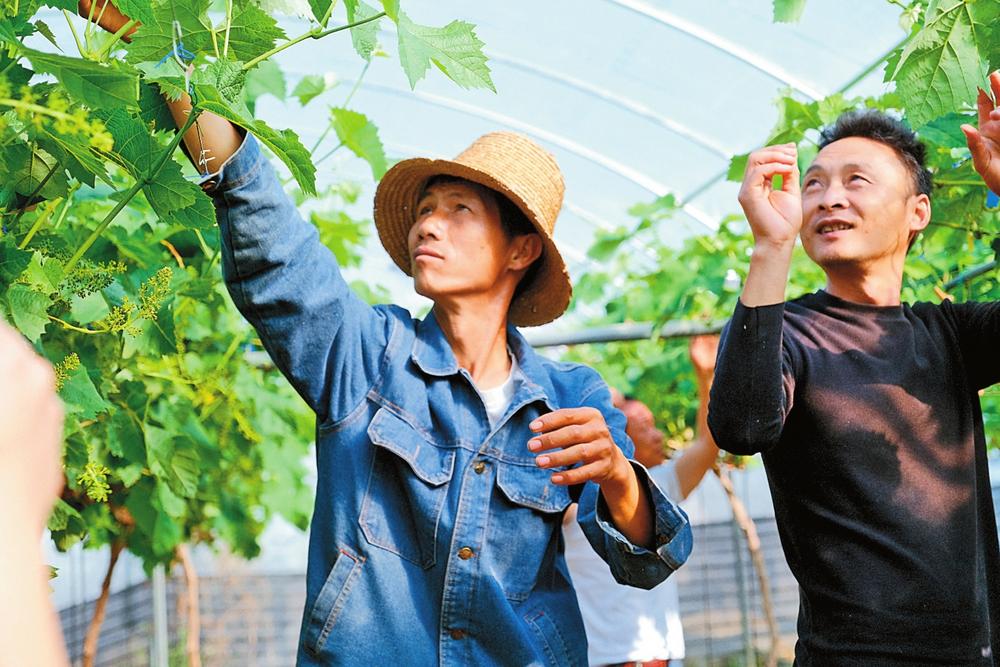 農(nóng)戶為葡萄抹芽、定梢。 本報(bào)通訊員 張玨 攝