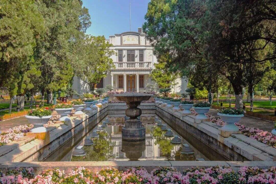 僅一墻之隔,卻是兩個世界,它的西邊緊鄰盤龍江,東邊面對昆明南北主要交通干道——北京路。外面的世界高樓林立,盡顯現(xiàn)代化都市風(fēng)范;墻內(nèi)則是綠意盎然,閑亭、小池、飛鳥,幾座古典小洋樓藏于大片綠蔭。