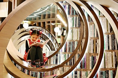 鐘書閣北京老佛爺?shù)?,一名兒童正在閱讀書籍。店內(nèi)圓環(huán)的設(shè)計(jì)借鑒了中國(guó)傳統(tǒng)園林的形態(tài)。