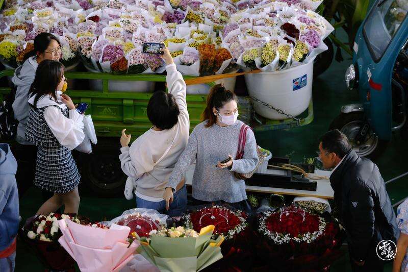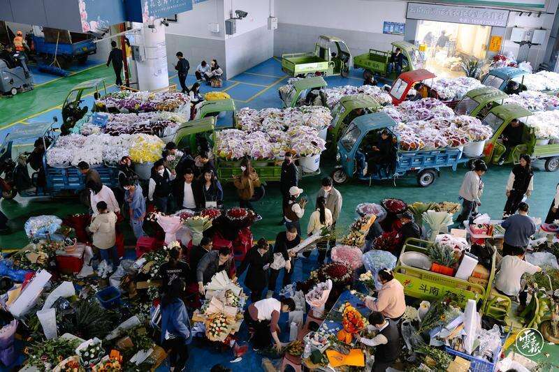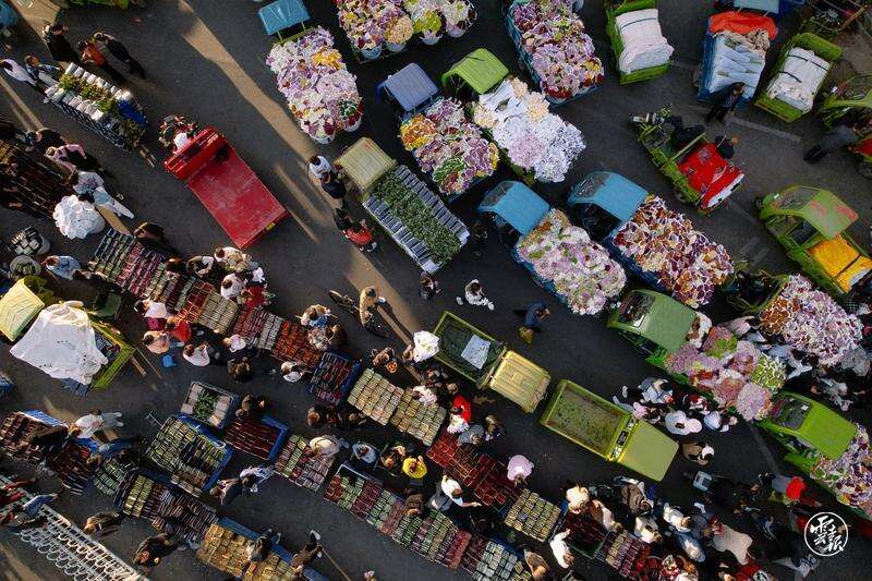 連日來,昆明花卉市場進(jìn)入新春開局的交易高峰期。每天傍晚6時許的斗南花市便開始了新一輪的清場,花商們駕駛花車在市場入口處排隊等待進(jìn)場,市民游客穿梭其中選購鮮花,航拍視角下的斗南花市市場內(nèi)外一片繁忙。