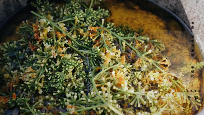 春光里,山野間,尋一簇染飯花,把染飯花用熱水泡開,花的顏色就會(huì)充分溶解在水中,將水染成金黃色。再將染飯花水放進(jìn)淘好的新米中,蒸出來(lái)的米飯黃燦燦,透著植物的清香。一坨入口,松松軟軟、滿口生香。