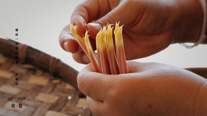 摘一朵芭蕉花,一層一層剝掉其最外面的紫紅色花苞片。取出花蕊,去除苦芯,再把花中白色的瓤切成片,然后把處理好的芭蕉花放入燒開的水中焯水,把切好的臘肉放入鍋中煮熟,再倒入芭蕉花,放入適當(dāng)?shù)柠}、辣椒,待湯呈乳白色就可以盛出享用了。夾上一口芭蕉花放入口中,細(xì)細(xì)品味,一股特有的清香把春天的氛圍徹底拉滿。