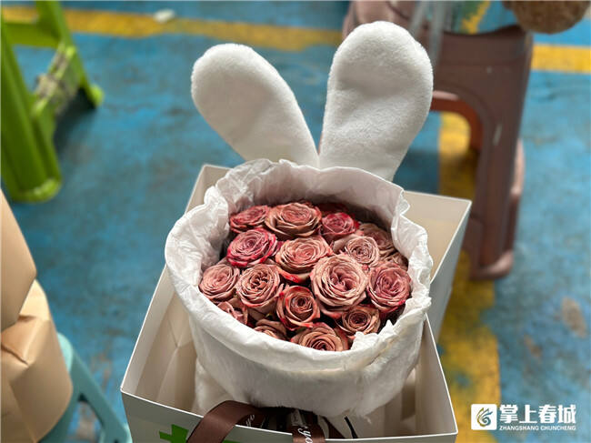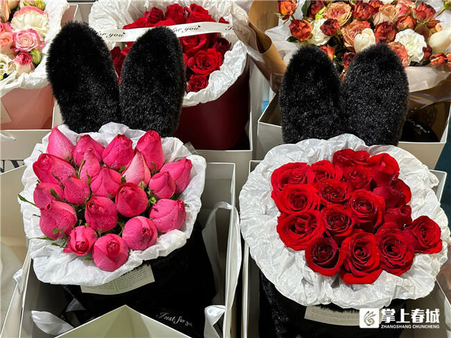 記者在斗南花市看到,紅玫瑰、粉玫瑰等各式各樣的玫瑰,包裹在毛茸茸的“兔耳朵”造型內,上面點綴著紅色小愛心,軟萌造型吸引了不少前來買花的市民。