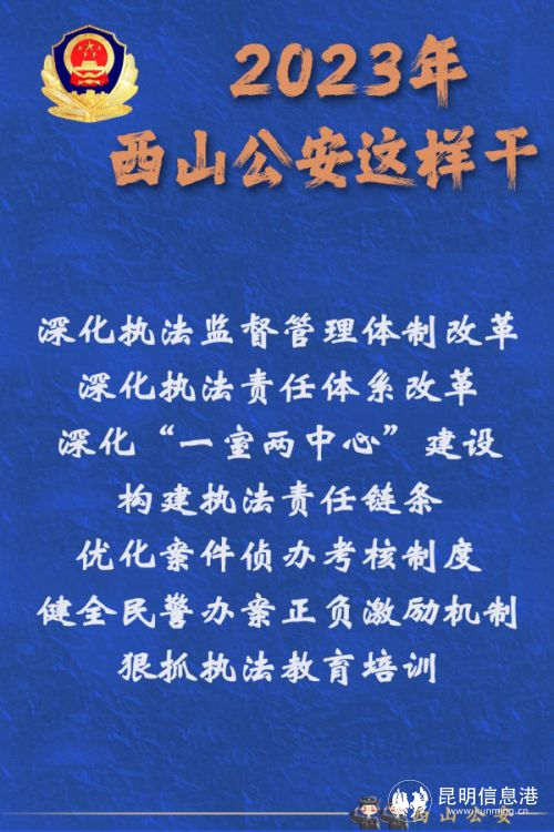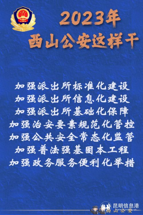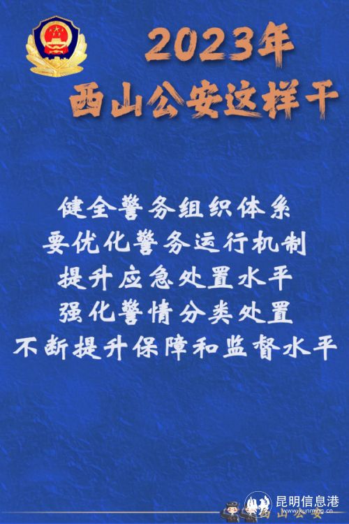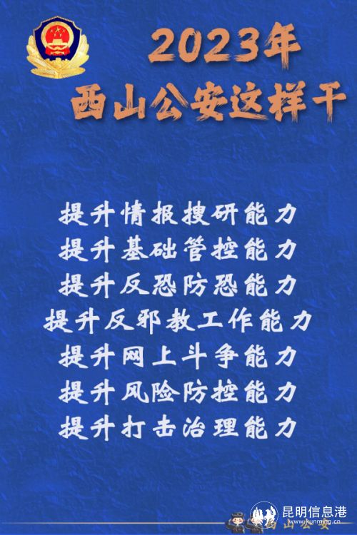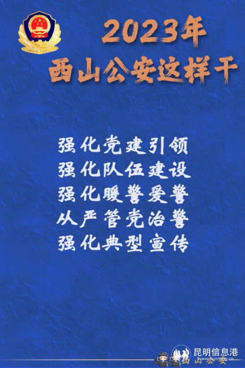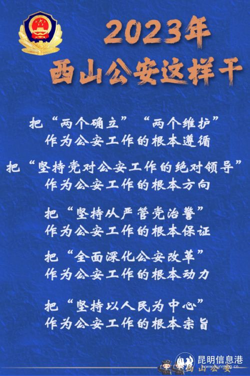 2023年,西山公安將以愚公移山的志氣、滴水穿石的毅力和“起步就是沖刺、開局就是決戰(zhàn)”的姿態(tài),堅定不移朝著既定目標(biāo)奮勇前進(jìn),為維護(hù)國家政治安全、確保社會大局穩(wěn)定、促進(jìn)社會公平正義、保障人民安居樂業(yè)作出新的更大貢獻(xiàn)。(昆明信息港 記者合宇聰 西山警方供圖)