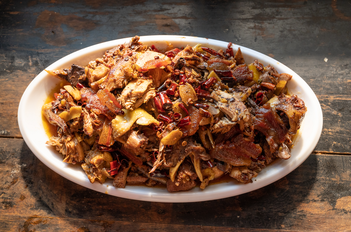 撒梅雞制作是用煮熟的雞肉與腌肉一起“回鍋”炒,花椒、姜片、干椒將肉香完全激發(fā),外表酥脆,里面卻鮮嫩多汁。撒梅雞與舂糍粑、豬八碗、苞谷酒、肝生、鲊、糍粑、苦蕎粑粑、玉米粑粑一同作為彝族撒梅人過年過節(jié)(火把節(jié))松毛席以及婚喪嫁娶等彝族撒梅人社會活動中必不可少的一道特色菜品,深受當(dāng)?shù)厝说南矏邸?/p>