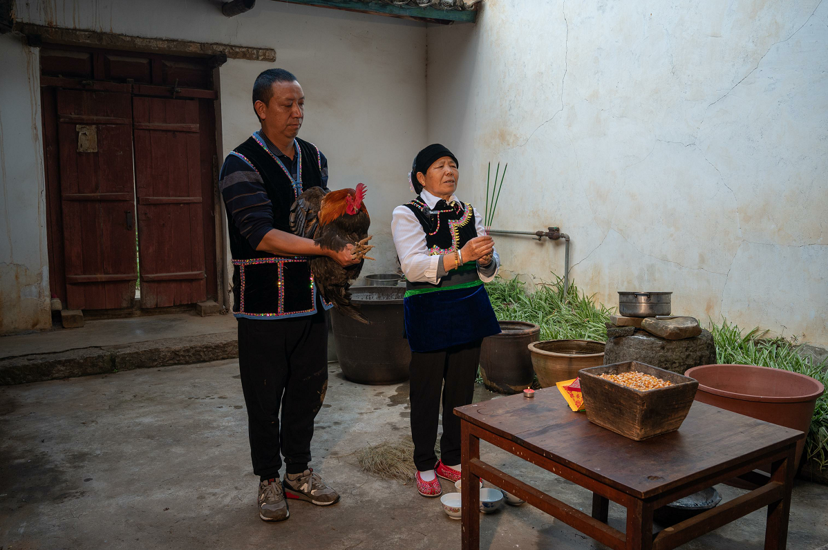 2022年10月25日,昆明市經(jīng)開區(qū)阿拉彝族鄉(xiāng)海子村,撒梅人李勇(左)與母親正在進(jìn)行宰殺公雞前的祭拜儀式。