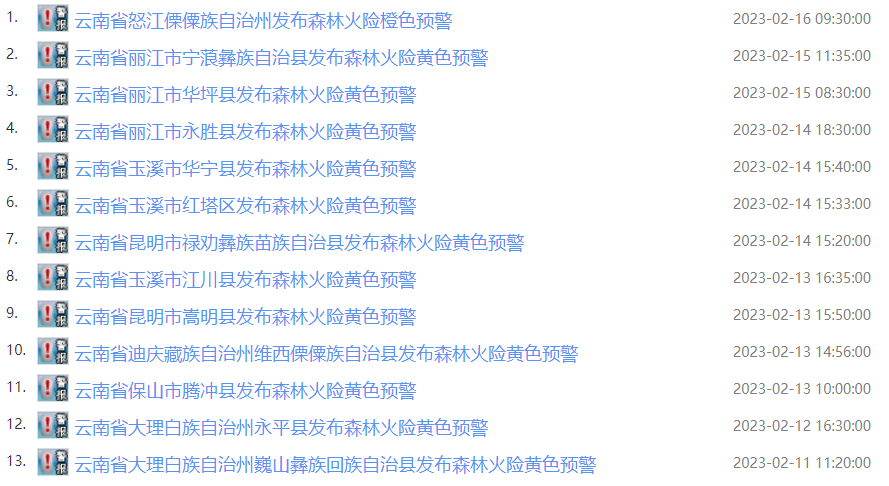 云南省氣候中心提醒,目前云南省大部地區(qū)出現(xiàn)了中度及以上氣象干旱,預(yù)計(jì)2月中下旬大部地區(qū)氣象干旱可能進(jìn)一步發(fā)展,需注意防范對(duì)農(nóng)業(yè)生產(chǎn)和人畜飲水的影響。此外,還需關(guān)注滇西地區(qū)的高森林火險(xiǎn)氣象等級(jí)。連日來,云南多地發(fā)布森林火險(xiǎn)預(yù)警。
