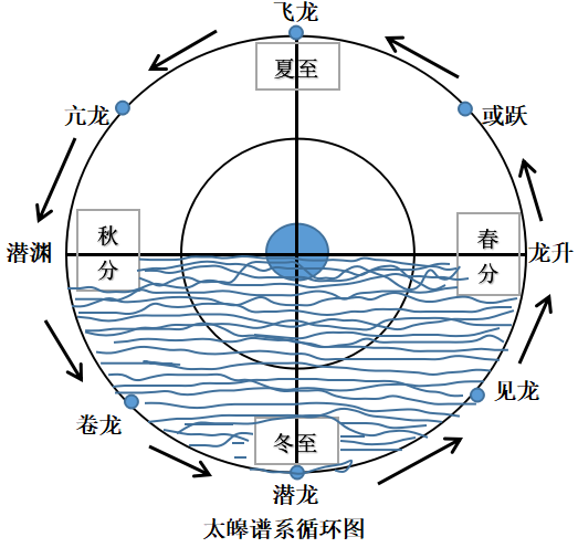 《易經(jīng)》中的元、亨、利、貞,到北宋時(shí)周敦頤即用以配四時(shí),是取自于自然界植物的生長(zhǎng)過程。元:象征事物的初始,對(duì)應(yīng)春天草木萌發(fā)。亨:象征事物的成長(zhǎng),對(duì)應(yīng)夏天植物的生長(zhǎng)。利:象征事物的收獲,對(duì)應(yīng)秋天植物的果實(shí)。貞:象征事物的收藏,對(duì)應(yīng)冬天,植物落葉過冬。龍(太陽(yáng))的運(yùn)行規(guī)律可用于一天,也可用于一個(gè)太陽(yáng)回歸年,它在《易經(jīng)》中表達(dá)為: