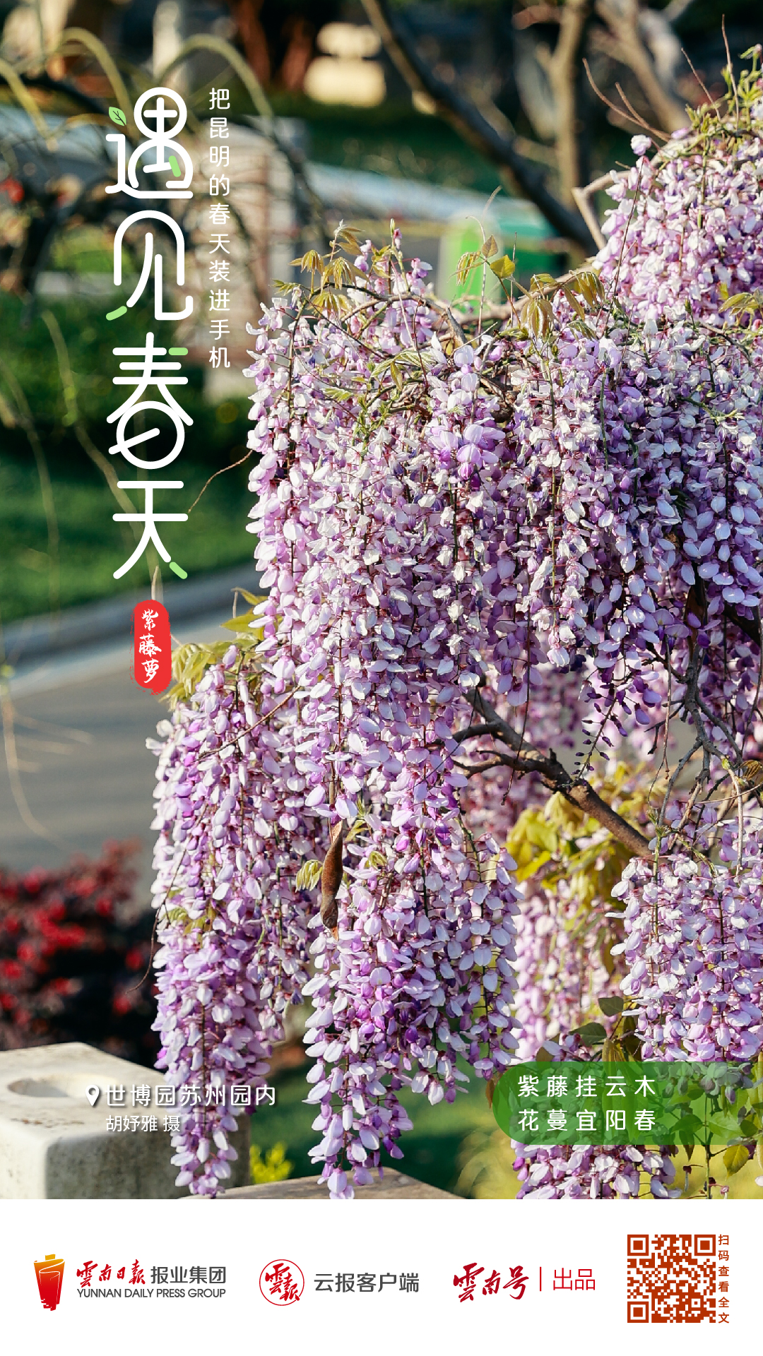 圖為2023年3月,世博園蘇州園內(nèi)的紫藤蘿花。初春,紫藤蘿花開了。“紫藤掛云木,花蔓宜陽春。密葉隱歌鳥,香風(fēng)流美人”。紫藤蘿花瀑布深深淺淺的紫溫柔無比,只望一眼,便能動(dòng)人心。云南日報(bào)記者 胡妤雅 攝