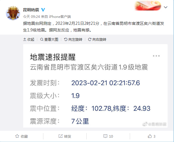 據(jù)云南省昆明市防震減災(zāi)局官方微博@昆明防震 消息:據(jù)地震臺(tái)網(wǎng)測定,2023年2月21日2時(shí)21分,在云南省昆明市官渡區(qū)矣六街道發(fā)生1.9級(jí)地震。據(jù)網(wǎng)友反映,地震有感。