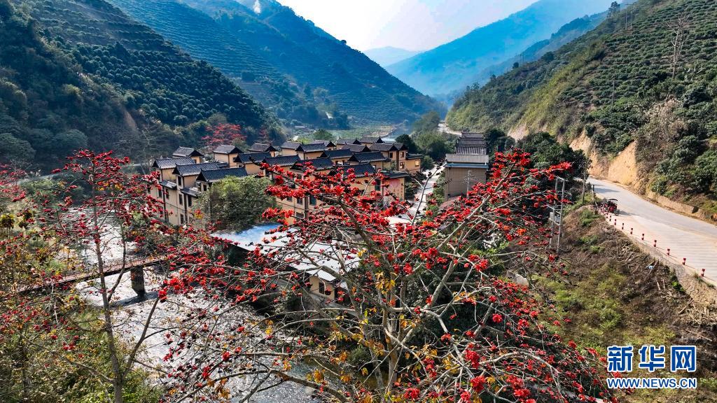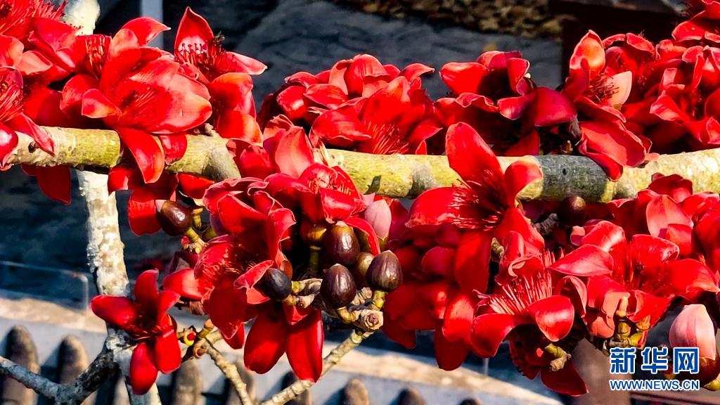 近日,云南省紅河哈尼族彝族自治州屏邊苗族自治縣南溪河邊,木棉花相繼盛開。在獨具特色的苗式建筑的映襯下,火紅的木棉花與江水形成了一幅“花開紅錦繡,水漾碧琉璃”的春光畫卷。(李關(guān)偉 李超 王國輝 許容珠)