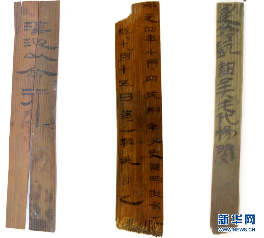 河泊所遺址出土的三枚有字簡(jiǎn)牘。(云南省文物考古研究所 供圖)