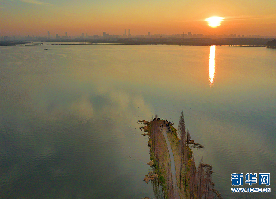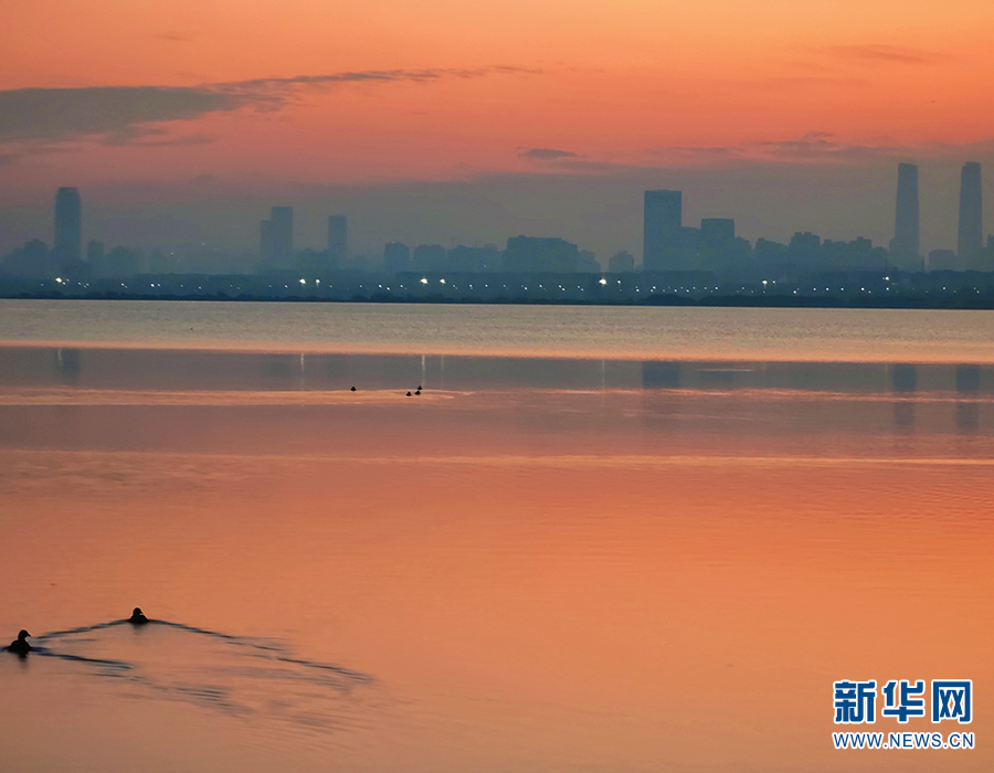 金色的晨光灑在湖面上(2月18日攝)。新華網(wǎng)發(fā)(楊景浩 攝)
