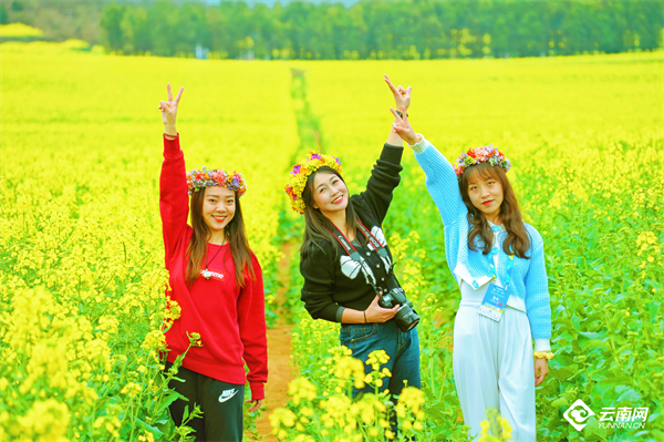云南的二月,大自然的萬物都在奔赴一場關(guān)于春天的盛宴。在云南省曲靖市羅平縣,百萬畝油菜花田形成了一片片金黃璀璨的花海。游客們置身于一望無際的金色海洋中,女士們紛紛將油菜花編成的花環(huán)戴在頭上駐足留念,好一幅“金玉滿堂之鄉(xiāng)”的喜慶熱鬧圖景。