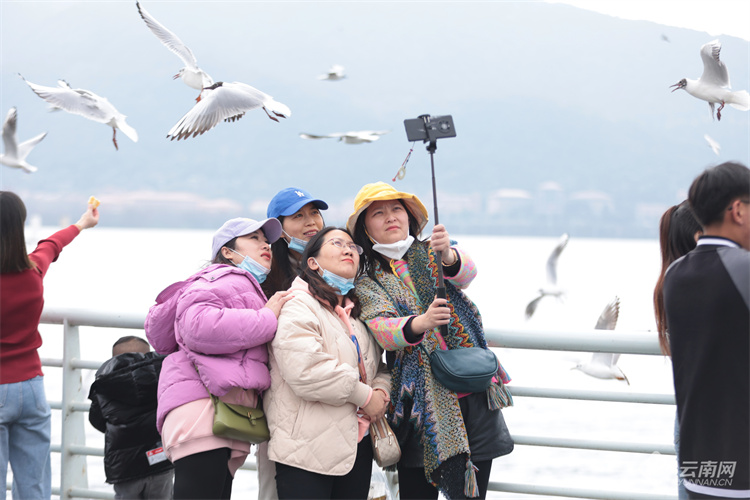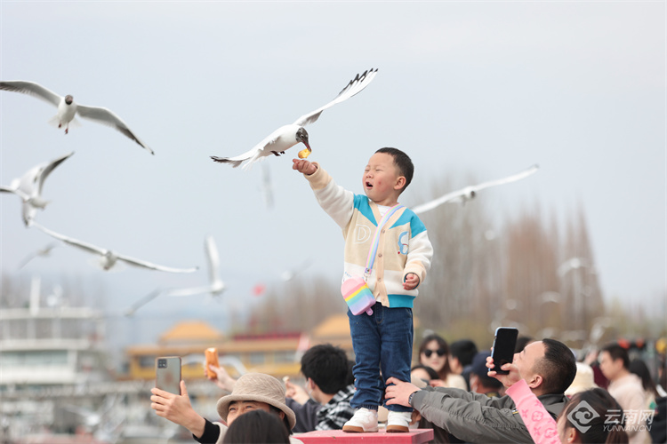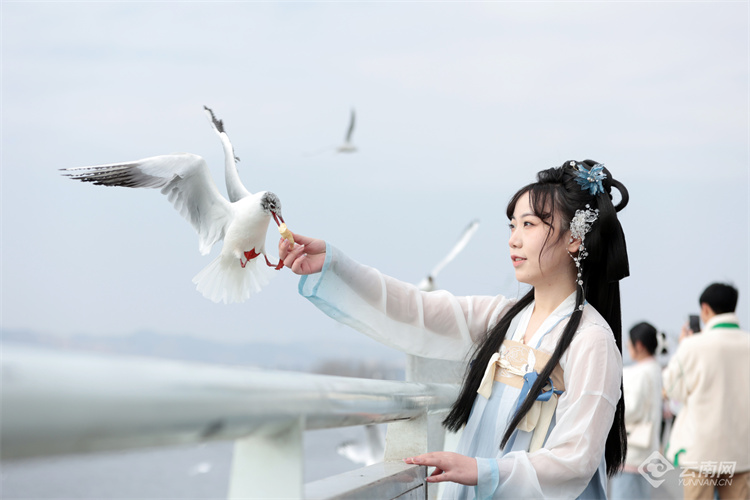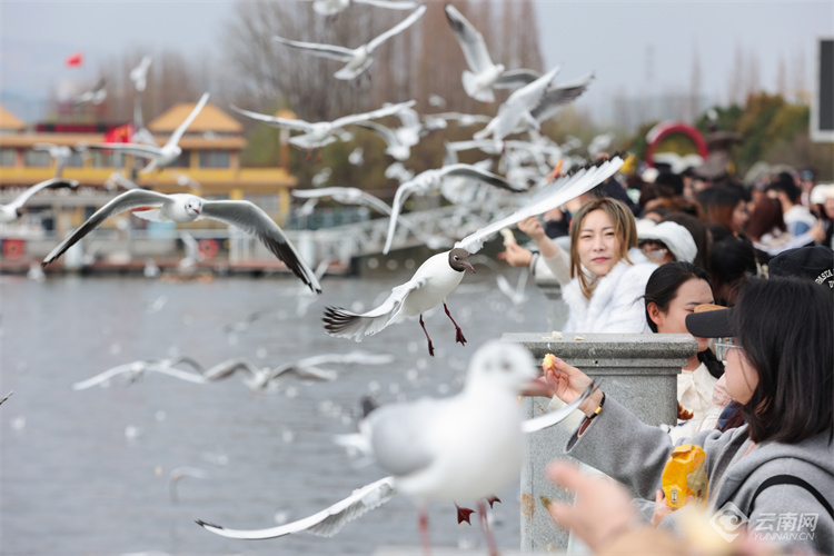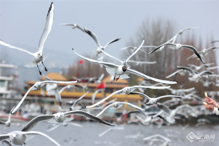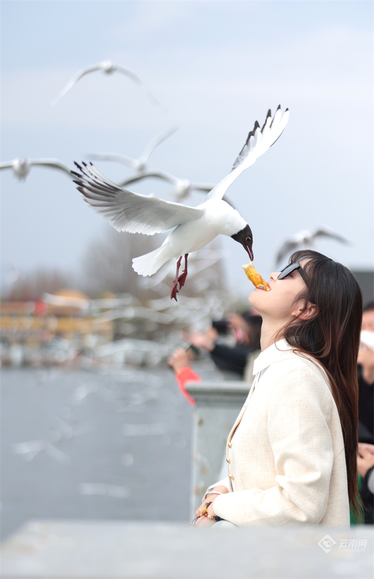 2月26日,昆明海埂大壩紅嘴鷗與人同樂(lè)。隨著天氣漸暖,不少紅嘴鷗頭上的羽毛已由白變灰、變黑,最后披上黑色“頭紗”。這也是紅嘴鷗逐漸成熟的標(biāo)志,紅嘴鷗換羽后將飛回棲息地繁殖后代。據(jù)鳥(niǎo)類專家介紹,預(yù)計(jì)3月10日后,紅嘴鷗將逐漸離開(kāi)昆明,4月底全部飛離。(云南網(wǎng) 記者陳飛)