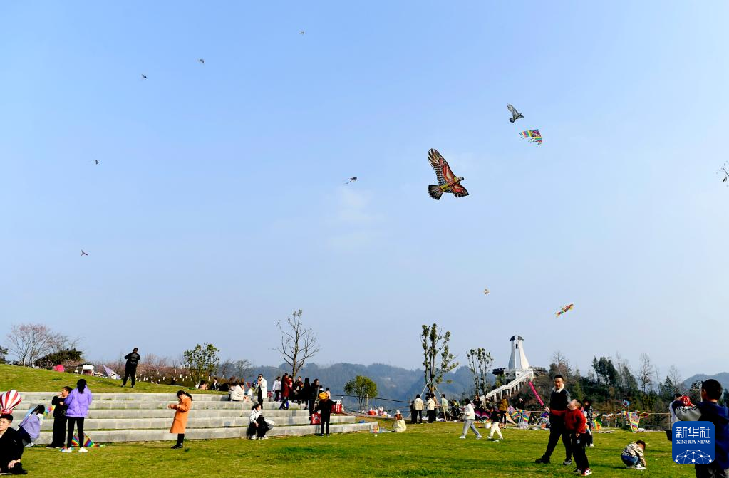 2月27日,人們在湖北省宣恩縣仙山貢水旅游區(qū)的一處草坪上放風(fēng)箏。