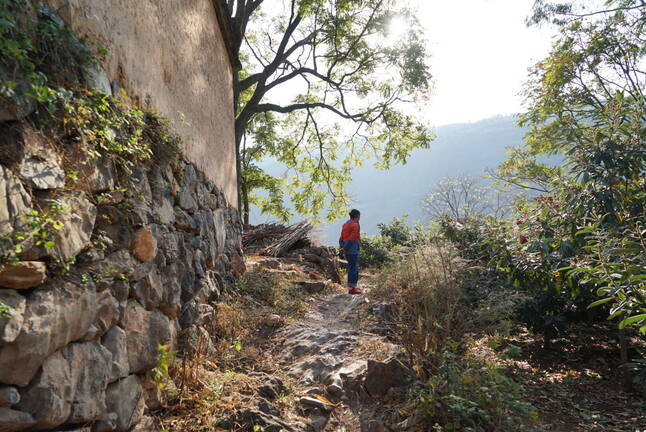 這是遺世古村。經(jīng)村的“石匠房銅運(yùn)古道”曾是通達(dá)京城的古道要塞,明清時(shí)期,商賈軍旅,販夫走卒,民工匠人不絕于村,在此飲馬食宿,駐足歇息,談古論今,小田壩繁榮興盛,成為銅運(yùn)古道上的溫馨客棧。盤纏于村口灰黑巨石上的大葉榕是村民心目中的“神樹”,這棵樹粗達(dá)數(shù)米,盤根虬結(jié),樹冠遮天蔽日,樹下溪水淙淙。閑暇時(shí),村內(nèi)男女老少坐在樹底下吹風(fēng)乘涼、拉家常,暢享鄉(xiāng)村愜意時(shí)光。榕樹西側(cè),是記載劉漢鼎修筑“石匠房銅運(yùn)古道”的“劉公橋路碑”,碑文字體雋秀、行文優(yōu)美、字跡清晰,讀起來朗朗上口:螳螂一邑,幅員遼闊,壤接川黔,固商旅輻輳之區(qū)也。而歲賦京銅不下數(shù)百萬,猶于運(yùn)道為扼要焉。碑文為乾隆五十六年七月會(huì)澤知縣蔡世忱所寫。碑刻共兩塊,其中一楹聯(lián)“敢惜微勞繼父志,唯期永固利人行”講述的是劉漢鼎去世后,其子繼承父親意志,長期對(duì)古道進(jìn)行維修,以便利行人來往的史事。