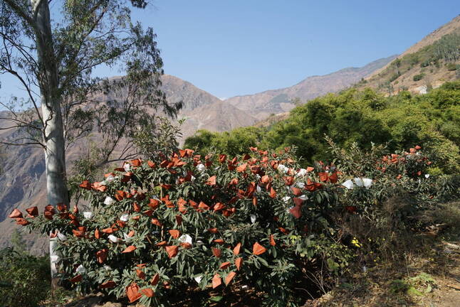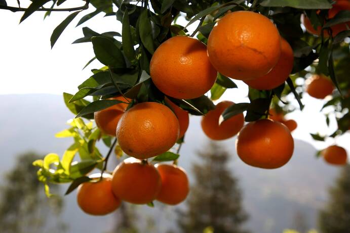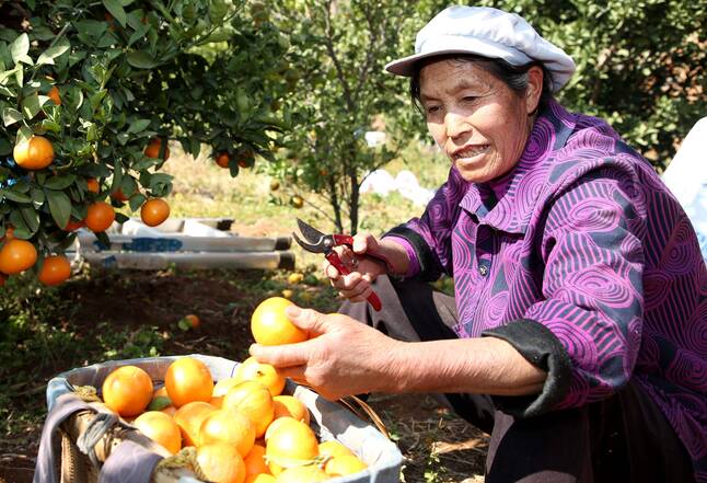 這里物產(chǎn)豐美。由于海拔和地理原因,小田壩氣候溫暖濕潤,植被覆蓋率高,全年日照充裕,無霜期長,土壤礦物質(zhì)含量豐富、保水保肥力強(qiáng)、不易積水等,為水果種植提供得天獨(dú)厚的條件。這里出產(chǎn)柑橘、土瓜、枇杷、香蕉、芭蕉等水果,種植紅薯、大豆、蠶豆等農(nóng)作物,以及生姜、砂仁、甘蔗等經(jīng)濟(jì)作物。村后,一片片果園布滿山坡,黃澄澄的沃柑掛滿枝頭,我們來拍照時(shí),果農(nóng)付加勝一家正在采摘晚熟沃柑,分揀、挑運(yùn)、裝車......忙得不亦樂乎。熱情好客的他臉上洋溢著豐收的喜悅,趕緊把最好的柑橘分享給來果園里的客人,臨行還把最甜、最大的果子裝成袋送給客人帶走。