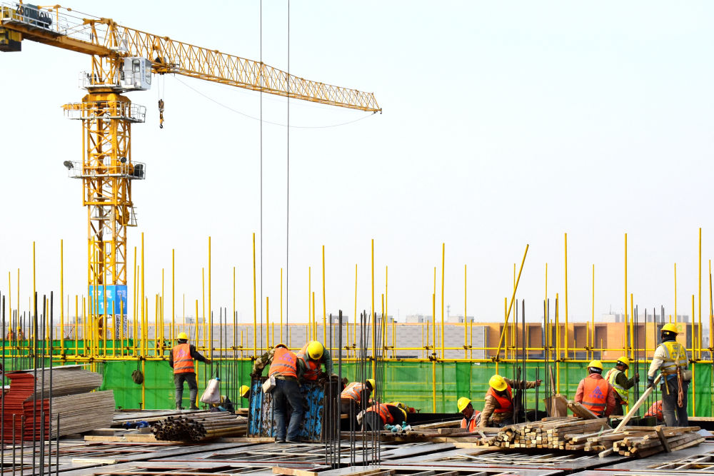 2月22日,濟南國際標準地招商產業(yè)園基礎設施二期項目4號廠房,工人正在為3樓頂板澆筑鋪設模板。新華社記者陳灝 攝