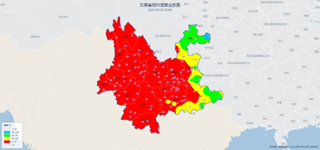 從3月1日下午15時云南省相對濕度圖上看到,除了滇東、滇東南邊緣外,大部地區(qū)空氣相對濕度不足30%,天氣顯得非常干燥。