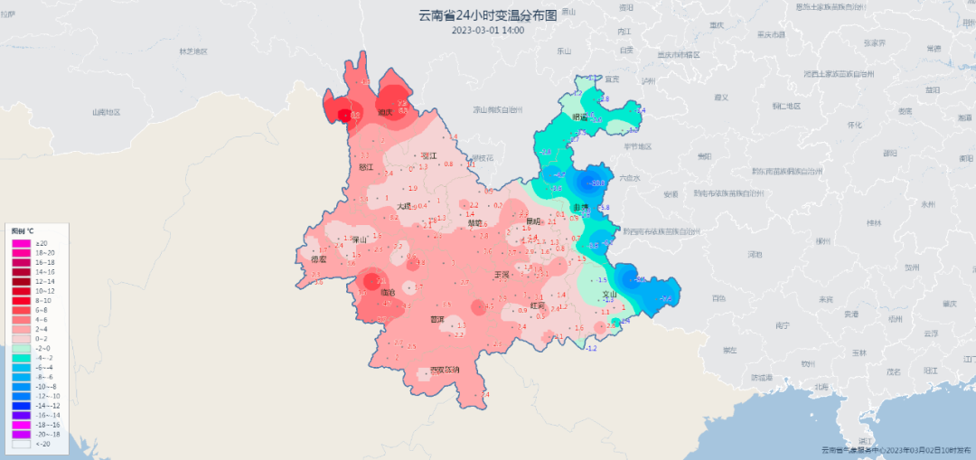 3月1日在冷空氣影響之下,昭通南部、曲靖東部、文山東部日最高氣溫下降了 6~8℃,局部 10~12℃;降溫的同時,昭通、曲靖東部、文山、紅河東南部還伴有小雨局部中雨落下,其中鎮(zhèn)雄甚至出現(xiàn)了雨夾雪天氣。