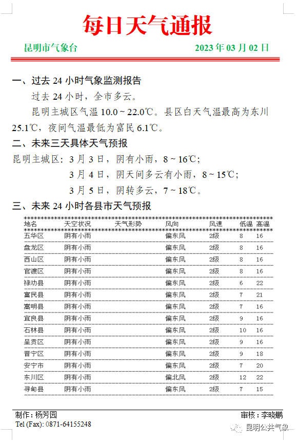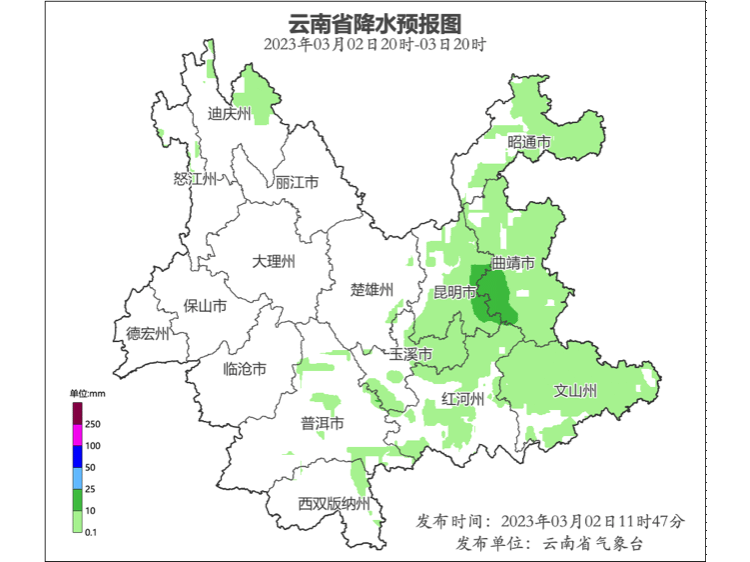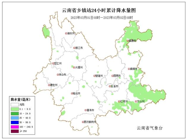 03月02日20時到03月03日20時:昭通、曲靖、文山、昆明、玉溪、紅河、普洱東部、西雙版納東部陰天間多云有零星小雨局部中雨,迪慶西部、怒江西部多云局部有陣雨,其它地區(qū)多云。