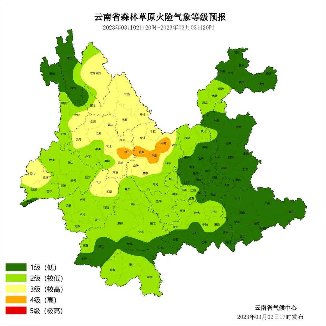 森林火險:預計未來24小時大理東部邊緣、楚雄中部4級,迪慶東部、怒江東部、麗江、德宏北部、大理、臨滄北部、楚雄北部3級,其它地區(qū)1~2級。