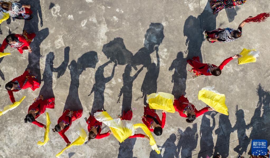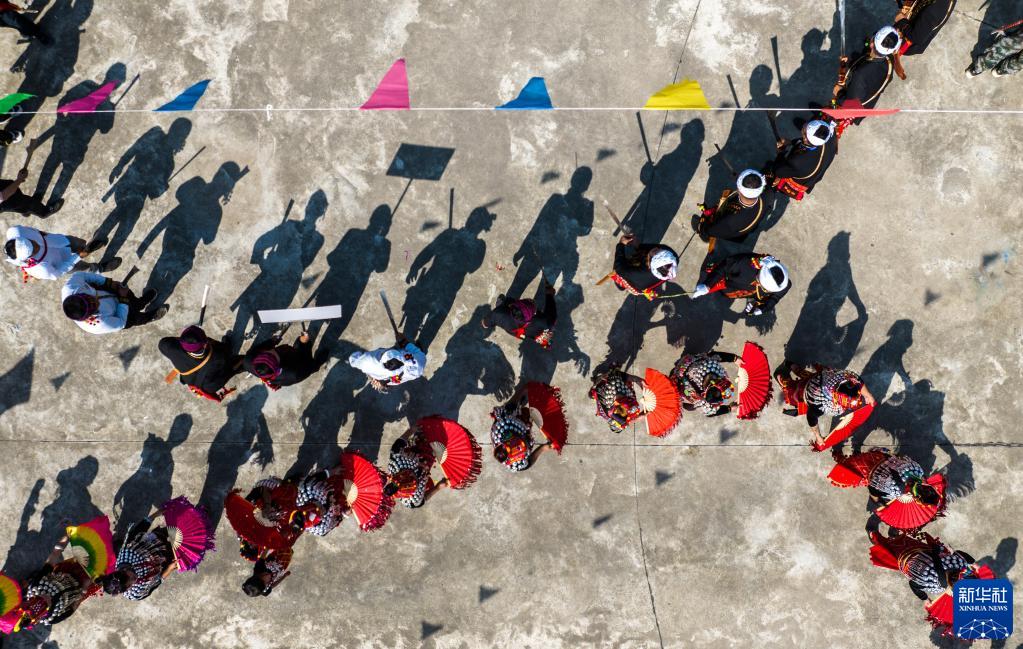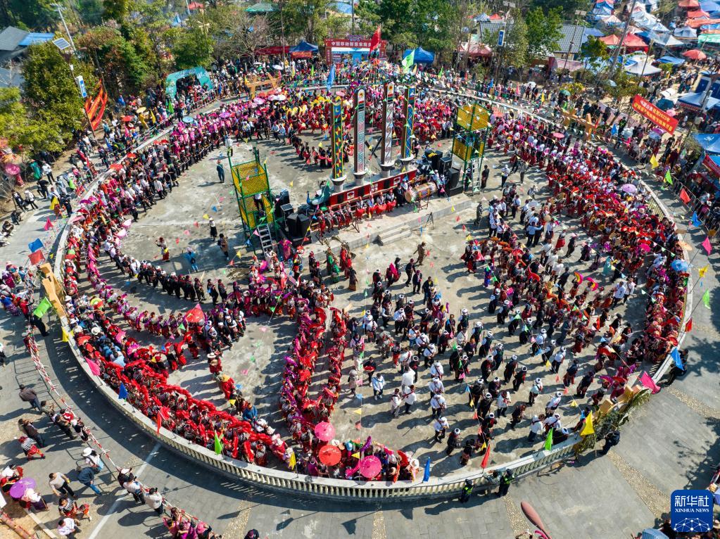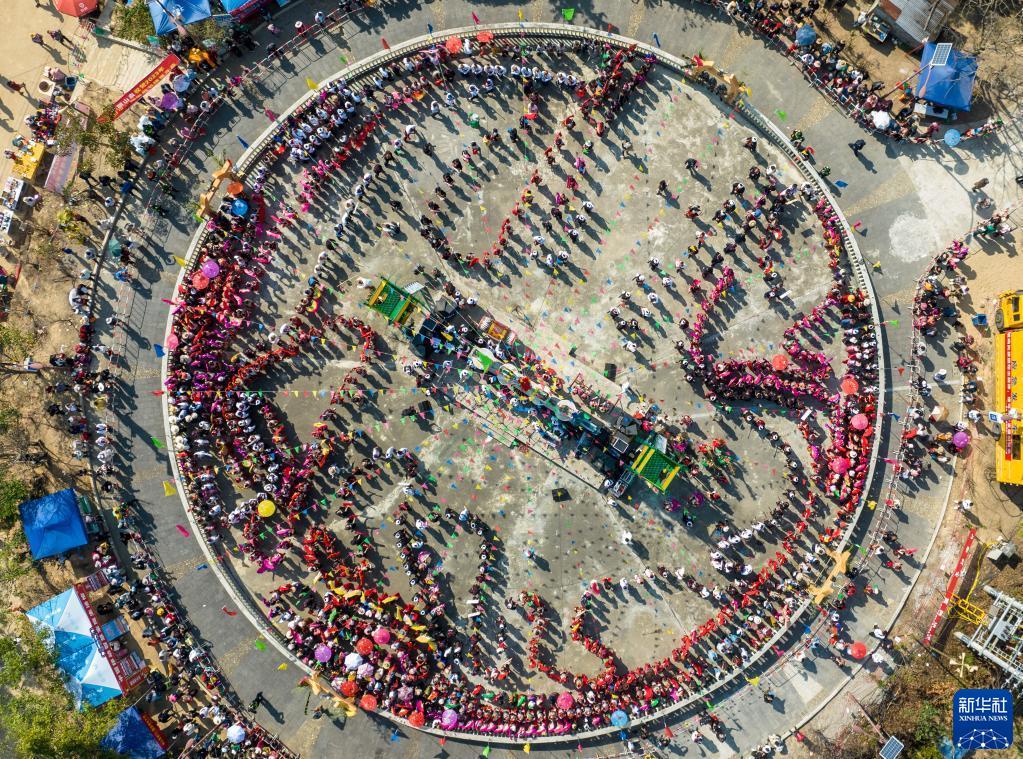3月2日,當?shù)厝罕娕c來自各地的游客踩著相同的鼓點進場舞蹈(無人機照片)。新華社記者 江文耀 攝