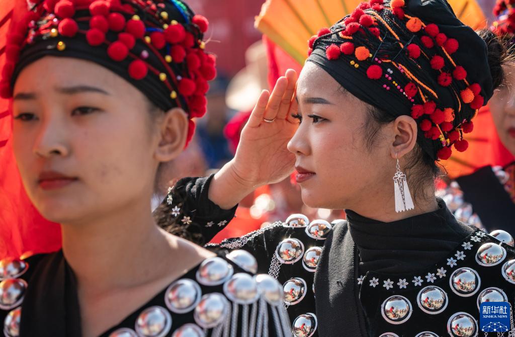 3月2日,“瑙雙”“瑙巴”(景頗語對領(lǐng)舞者的稱謂)領(lǐng)頭,帶領(lǐng)人們踩著鼓點有序進入舞場。新華社記者 江文耀 攝