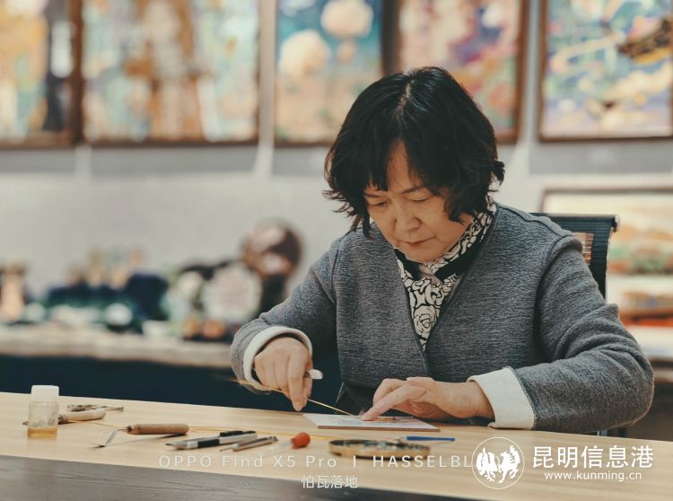 掐絲琺瑯彩畫是經過設計、繪圖、制作線描圖、掐絲(即用金屬絲在線描圖上勾勒出形狀)、上色(即用琺瑯釉料進行填色),用冷處理的技藝達到水晶瓷面的效果。櫻花節(jié)期間,昆明市非物質文化遺產掐絲琺瑯彩畫第六代傳承人、春城首席技師鄧璧玲作品將在非遺展上進行展示。