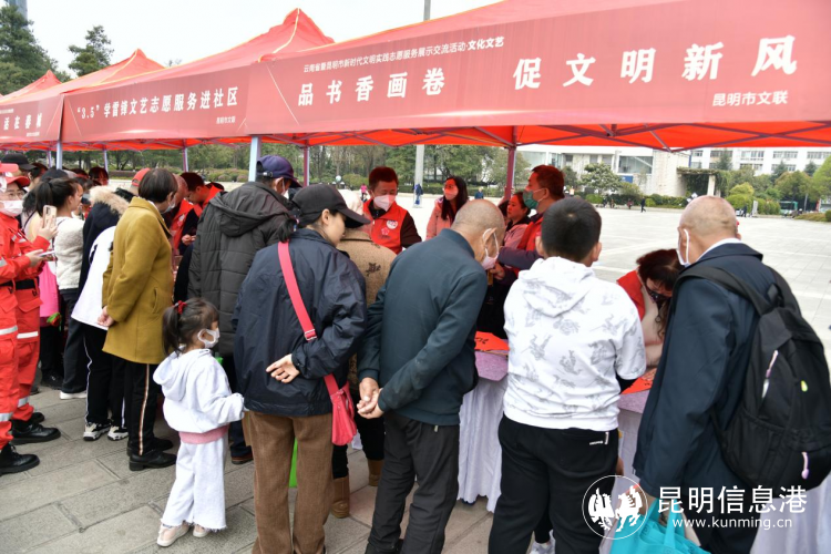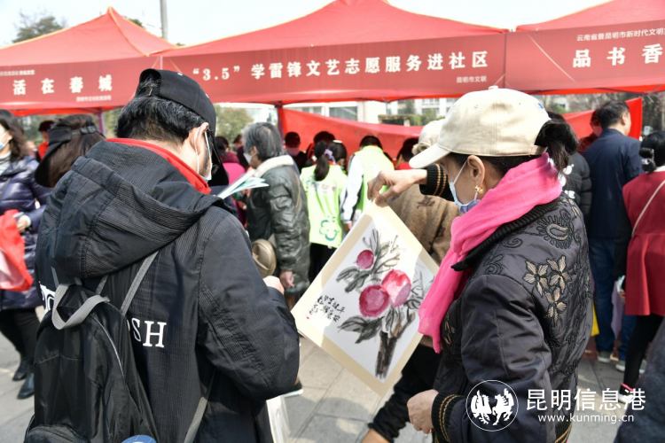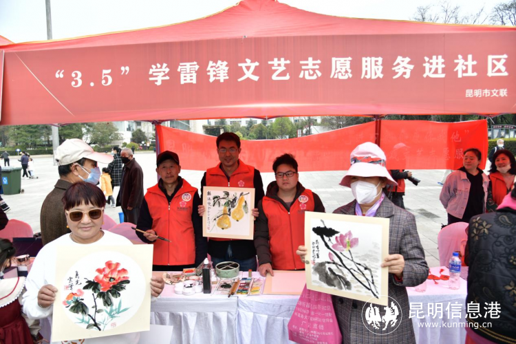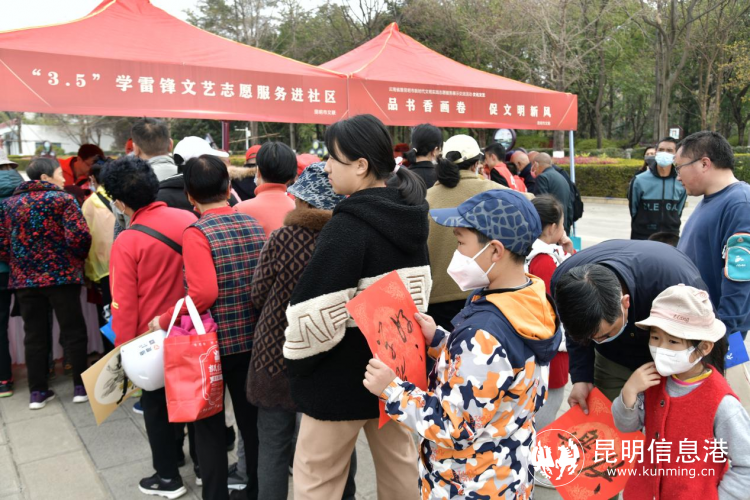 “3.5”學(xué)雷鋒紀(jì)念日——云南省暨昆明市新時(shí)代文明實(shí)踐文藝志愿服務(wù)活動啟動儀式后,文藝志愿服務(wù)團(tuán)隊(duì)以“品書香畫卷 促文明新風(fēng)”為活動主題,在現(xiàn)場開展創(chuàng)作、交流、惠民活動,展示書法美術(shù)之美,將書畫作品送到現(xiàn)場群眾和社區(qū)居民手中,推進(jìn)新時(shí)代文明實(shí)踐文藝志愿服務(wù)活動開展。