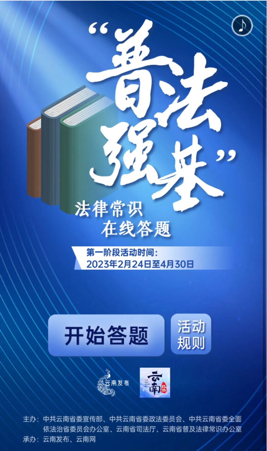 由中共云南省委宣傳部、中共云南省委政法委員會、中共云南省委全面依法治省委員會辦公室、云南省司法廳、云南省普及法律常識辦公室主辦、云南發(fā)布、云南網(wǎng)承辦的“普法強基法律常識在線答題活動”于2月24日正式上線。
