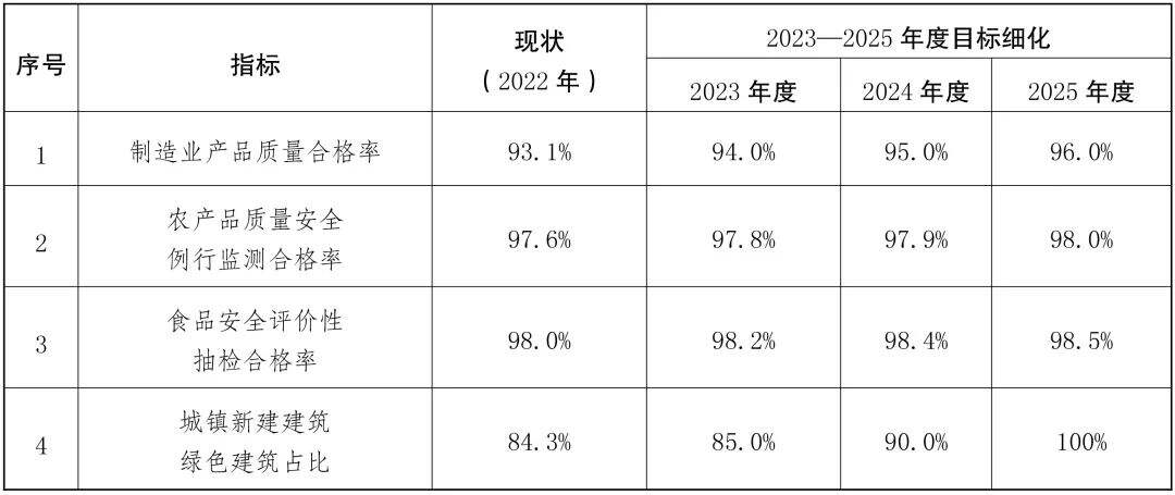 到2025年,新產(chǎn)品、新業(yè)態(tài)蓬勃發(fā)展,產(chǎn)品、工程、服務(wù)質(zhì)量水平顯著改善,制造業(yè)產(chǎn)品質(zhì)量合格率提高到96%,農(nóng)產(chǎn)品質(zhì)量安全例行監(jiān)測合格率達到98%以上,食品安全評價性抽檢合格率保持在98.5%以上,工程質(zhì)量抽查符合率不斷提高,城鎮(zhèn)新建建筑綠色建筑占比達到100%。
