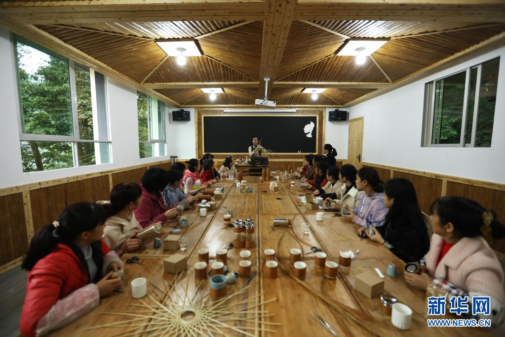 2020年11月5日,在貴州省赤水市大同鎮(zhèn)竹編非遺產(chǎn)學研基地,楊昌芹(中)在指導學員學習竹編。新華社發(fā)(王長育 攝)