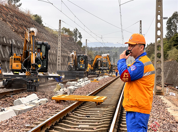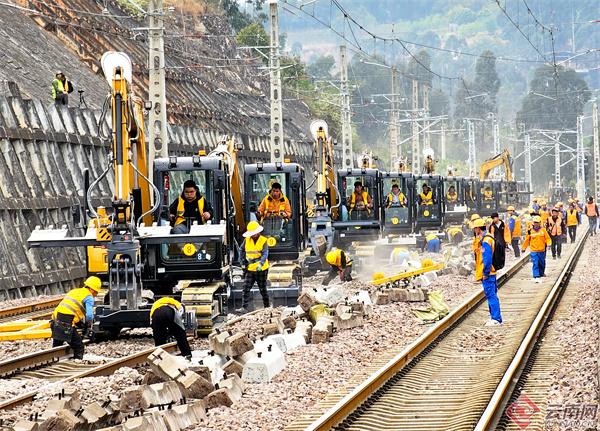 3月8日15時(shí),在南(寧)昆(明)鐵路石林南站,伴隨著施工命令的下達(dá),30多臺(tái)大型機(jī)械設(shè)備一字排開(kāi),轟鳴作響,開(kāi)始進(jìn)行線路換枕作業(yè),標(biāo)志著西南最大扶貧工程——南昆鐵路全面展開(kāi)大修施工,將進(jìn)一步改善線路設(shè)備狀態(tài),保障列車運(yùn)行安全,提升通道運(yùn)輸效率。