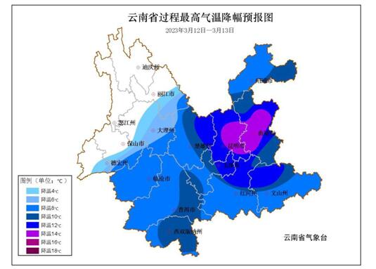 大部地區(qū)日最高氣溫將下降 8~10℃、局地12~14℃,昭通和曲靖北部高海拔地區(qū)有雨夾雪或小雪,曲靖東部、文山北部、紅河南部、普洱、 西雙版納有小到中雨。過程期間局地伴有雷暴大風和冰雹等 強對流天氣。