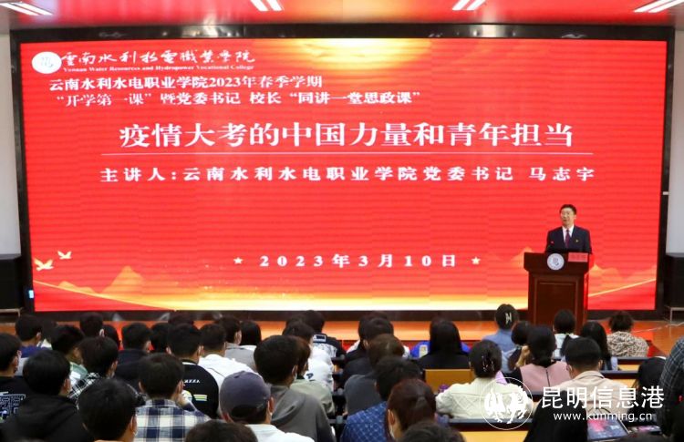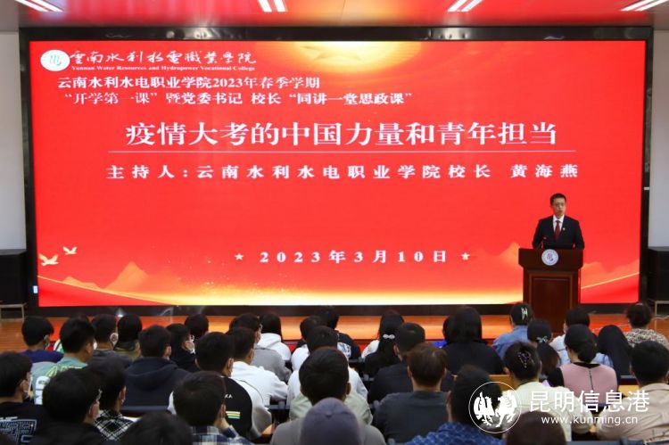 昆明信息港訊 3月10日,云南水利水電職業(yè)學(xué)院黨委書(shū)記馬志宇,黨委副書(shū)記、校長(zhǎng)黃海燕在富民校區(qū)學(xué)術(shù)報(bào)告廳同講“開(kāi)學(xué)第一課”暨書(shū)記、校長(zhǎng)“同講一堂思政課”。全體思政課教師、學(xué)生代表在學(xué)術(shù)報(bào)告廳主課堂參加學(xué)習(xí),2021級(jí)、2022級(jí)全體學(xué)生在分課堂通過(guò)網(wǎng)絡(luò)直播參加學(xué)習(xí)。全校共計(jì)7000余名師生參加線下線上學(xué)習(xí)。