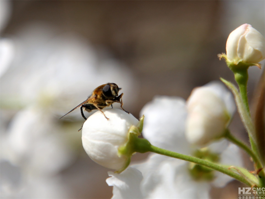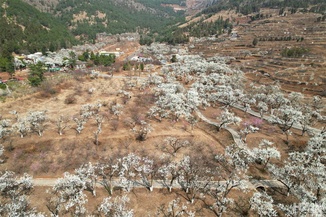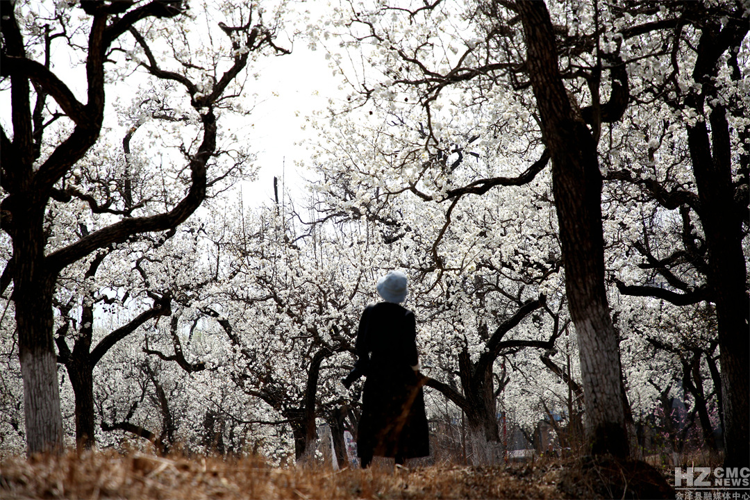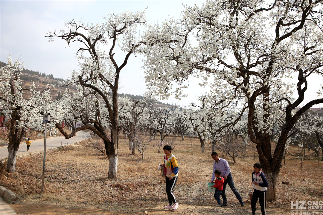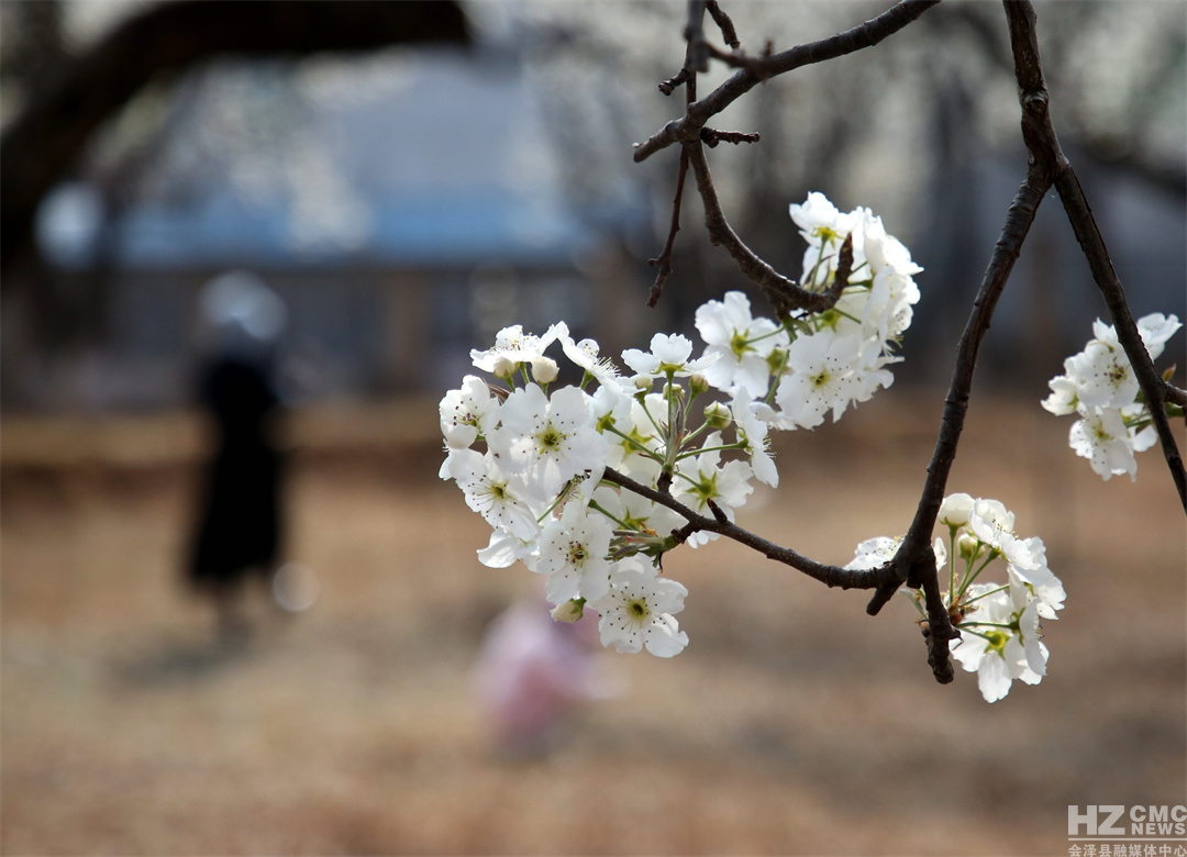 “放眼疑似白云落,風(fēng)來忽見梨花雨。”遠(yuǎn)遠(yuǎn)望去,滿樹梨花似團(tuán)團(tuán)云絮漫卷輕飄,浮動(dòng)在青綠的漣漪間,在藍(lán)天白云的映襯下,仿若人間仙境。細(xì)細(xì)看去,朵朵梨花競(jìng)相吐蕊,沐浴在明媚的春光里,一陣清風(fēng)過去,花瓣在微風(fēng)中含煙帶雨,紛紛而落,形成“梨花飛雪”的絕美風(fēng)景。