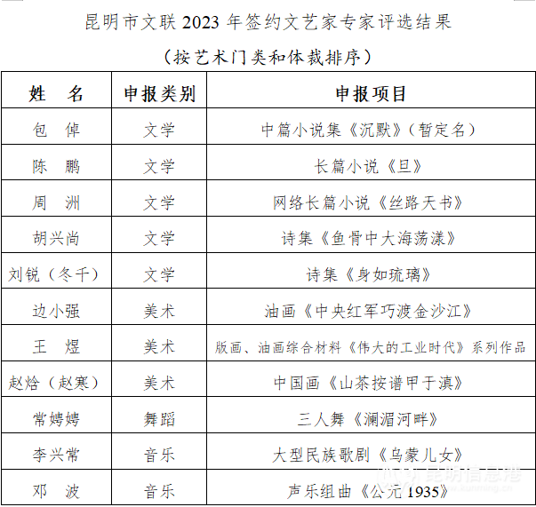 昆明市文聯(lián)2023年簽約文藝家專(zhuān)家評(píng)選結(jié)果