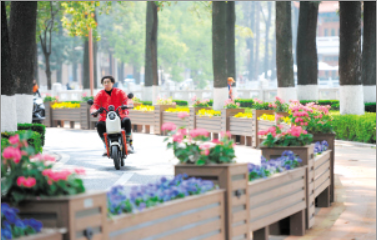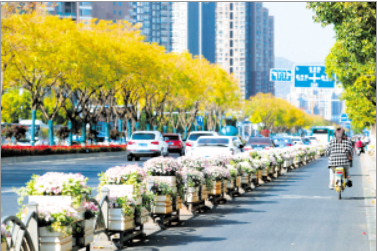 北京路兩側(cè)隔離綠化帶里種滿鮮花。 記者李海曦?cái)z