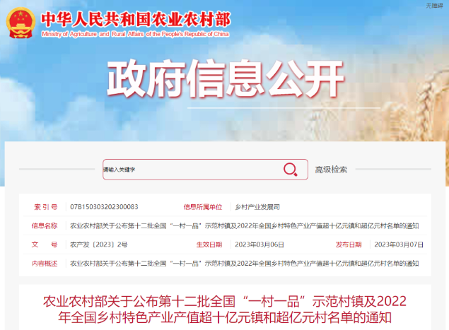 近日,農(nóng)業(yè)農(nóng)村部發(fā)布《關(guān)于公布第十二批全國“一村一品”示范村鎮(zhèn)及2022年全國鄉(xiāng)村特色產(chǎn)業(yè)產(chǎn)值超十億元鎮(zhèn)和超億元村名單的通知》。