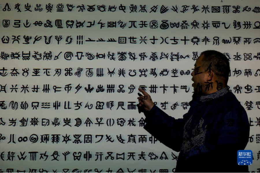 3月9日,三都水族自治縣水族文化研究院研究員潘政波在展示使用水書輸入法錄入的水書文字。