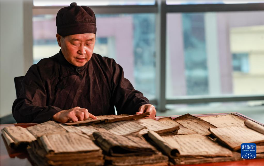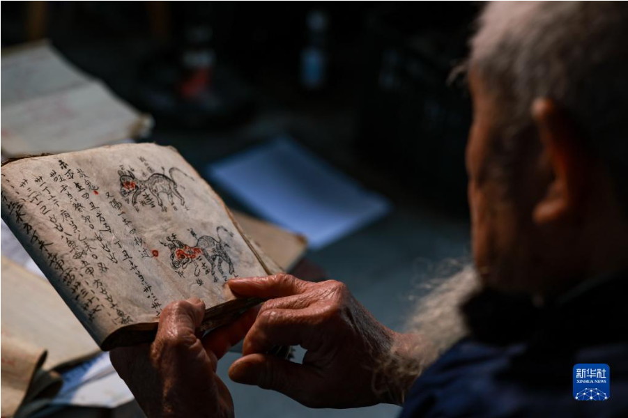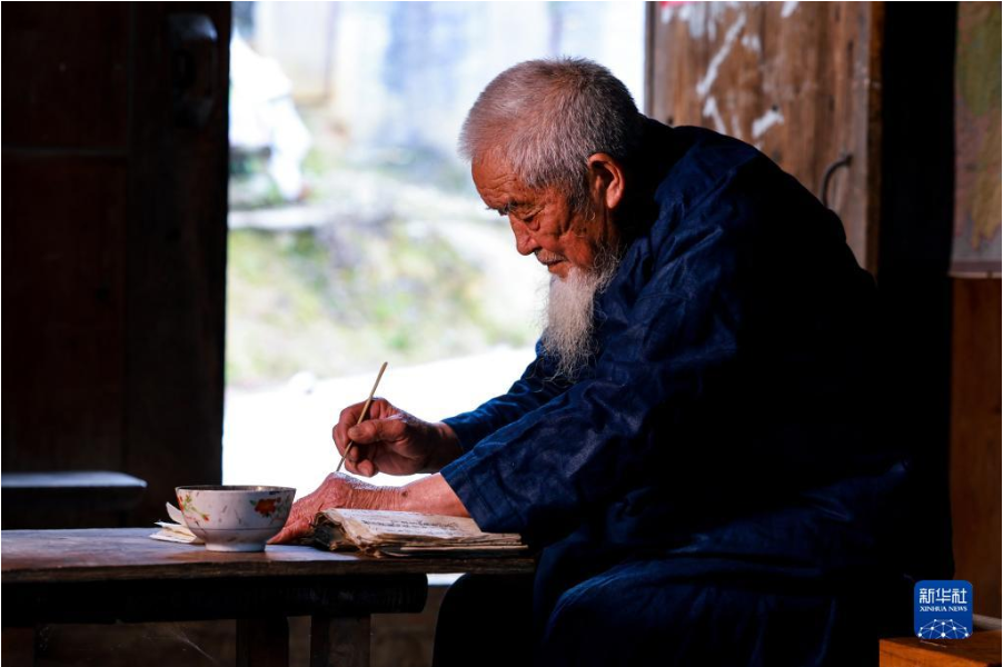 3月8日,水書先生姚覃軍在閱讀水書文獻(xiàn)。