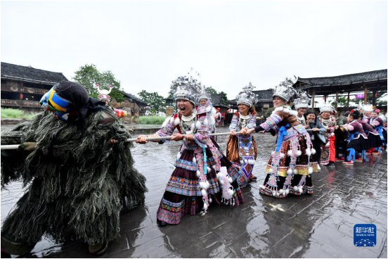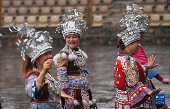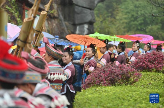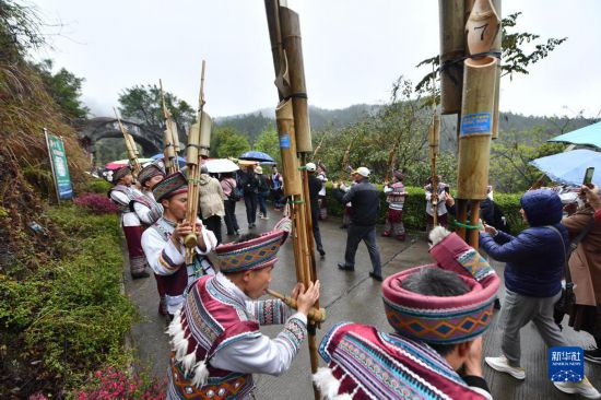3月19日,在廣西融水苗族自治縣雙龍溝森林旅游度假區(qū),苗族同胞用歌舞歡迎來自廣東省湛江市的游客。