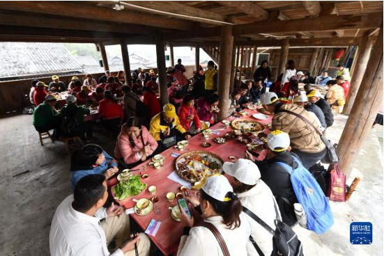 3月19日,在廣西融水苗族自治縣雙龍溝森林旅游度假區(qū)夢嗚苗寨,來自廣東省湛江市的游客在品嘗當?shù)孛朗场?/p>