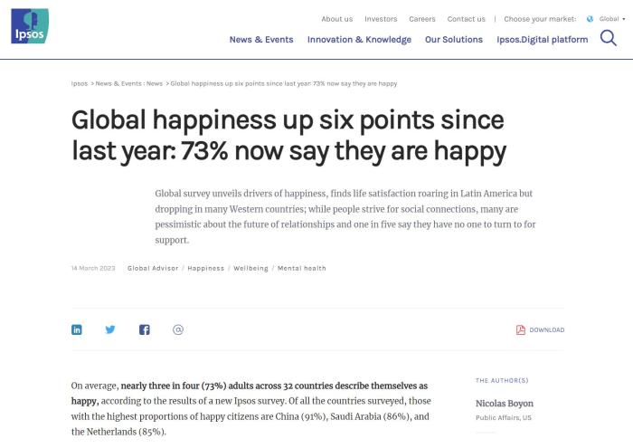調(diào)查結(jié)果顯示,平均而言,在32個國家中,近四分之三(73%)的成年人認(rèn)為自己很幸福。在所有接受調(diào)查的國家中,幸福感指數(shù)最高的國家是中國(91%),其后是沙特阿拉伯(86%)、荷蘭(85%)、印度(84%)、巴西(83%)。