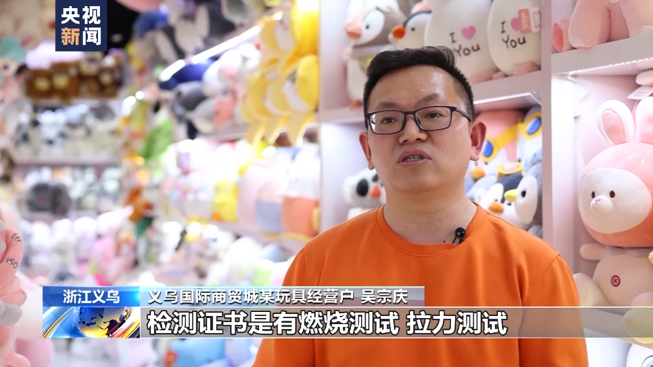 義烏國(guó)際商貿(mào)城某玩具經(jīng)營(yíng)戶(hù) 吳宗慶:檢測(cè)證書(shū)是有燃燒測(cè)試、拉力測(cè)試,還有重金屬測(cè)試。有了(檢測(cè))證書(shū)以后,就是說(shuō)不同的國(guó)家的客人,他只要有這份證書(shū),通用的那就可以出貨,所以說(shuō)客人一來(lái)就可以說(shuō),這個(gè)產(chǎn)品喜歡,我馬上就可以訂。