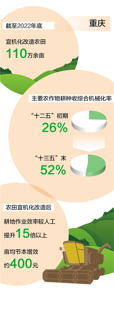 2015年起,重慶著眼于提升農(nóng)業(yè)機(jī)械化水平,探索推進(jìn)丘陵山區(qū)農(nóng)田宜機(jī)化改造。截至2022年底,重慶已對(duì)110萬(wàn)余畝農(nóng)田進(jìn)行了宜機(jī)化改造,主要農(nóng)作物耕種收綜合機(jī)械化率由“十二五”初期的26%提高到“十三五”末的52%。