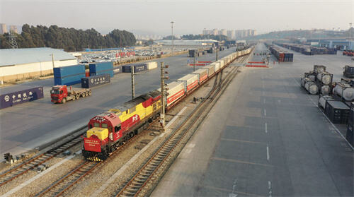 中老鐵路國際貨物列車從中鐵聯(lián)集昆明中心站駛出。(新華社發(fā))